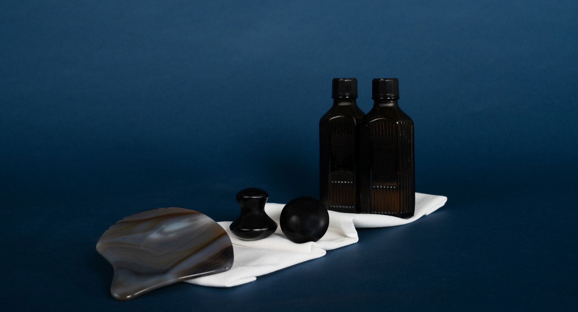 Un rituel facial rajeunissant utilisant l'ancienne pierre de quartz Gua-sha pour favoriser le drainage lymphatique, le lifting et la relaxation.